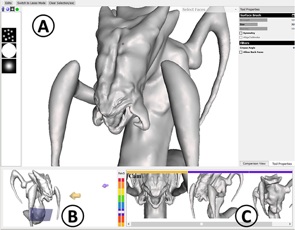 Our view authoring environment integrated in a 3D modeling software: (A) the main modeling window, (B) the authoring panel visualizing authored views in the spatial context, and (C) the navigation panel showing the authored views in the temporal sequence.
